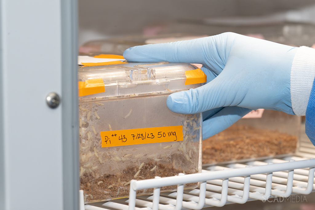 Another Ph.D. student, Bryce Shirk who was working on his master’s degree in Entomology and Nematology as a research assistant at the McGuire Center, helped establish the population of a Plodia colony at the Stoppel Lab. Upon joining the lab in the spring of 2021, he expanded the colony and studied environmental factors that influence silk production – resulting in an accepted publication. With Lauren’s help, he is now focusing on genetic modification strategies using CRISPR to create novel silk-like proteins. It is these advancements in modifying native silk fibers into advanced fibers that hold the key to addressing contemporary and future healthcare challenges.