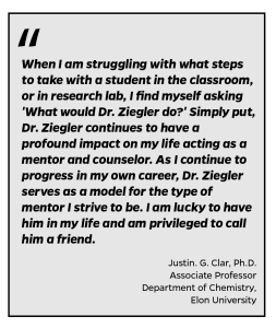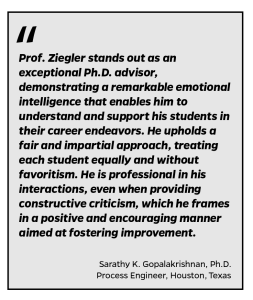 All these shared research projects and goals have led Ziegler to what he says is the best part of his experience – “the continual interaction that I have been able to maintain with my students after they graduate. Many of them continue to engage with our group after graduation – not for the sake of completing work that they were conducting but to ensure that the next generation of students is successful. I have also embraced my role as a lifetime mentor to my former students.”
